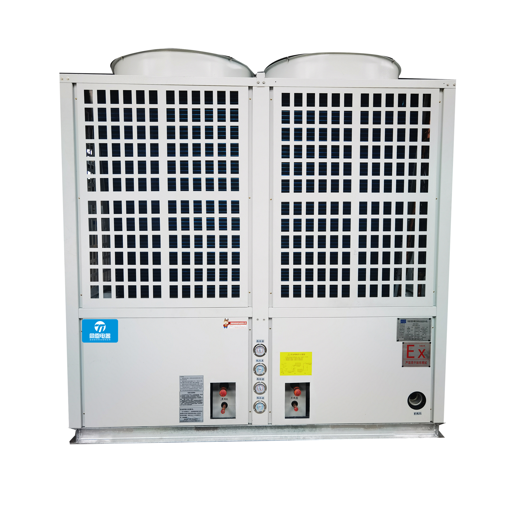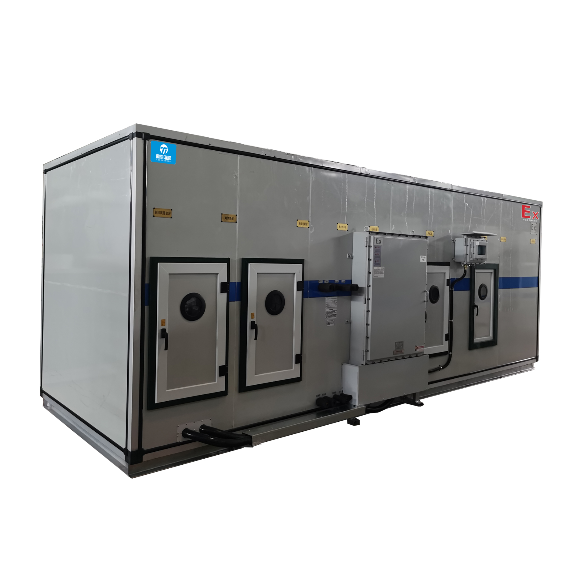 屋頂式防爆空調機組 全新風防爆空調機 屋頂式空調系統為全空氣系統,整個空調系統僅由室外主機和室內送風管兩部分組成,無需水泵、冷卻塔、風機盤管等配套設備,亦無需冷凝排水管道,安裝使用極為方便。系統室內無運動機械和水管,用戶無需為噪音和漏水煩惱,維修方便。機組置于屋頂或戶外空地,無需機房,節省初投資。機組不需二次冷媒,系統效率高。機組配上不同的功能段,可方便實現空氣凈化、除濕、加濕、降溫、供暖、新風量調節等多種功能。